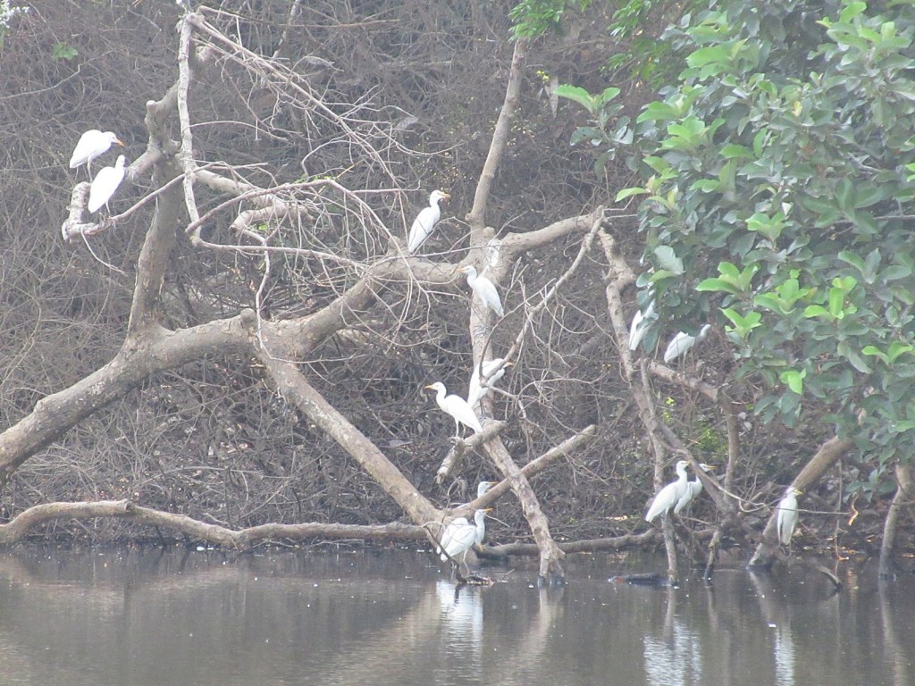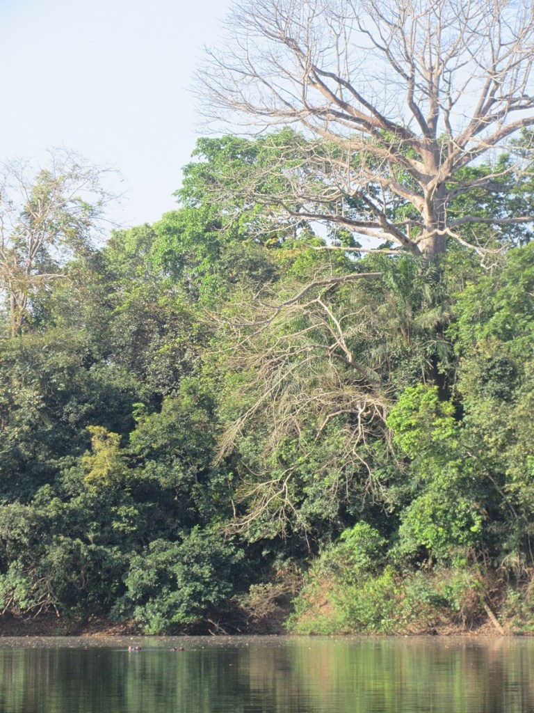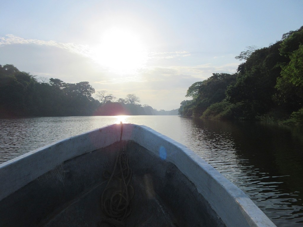 It was not a particularly early start. We woke up (for the final time anyway) later than we had expected and then were served a massive breakfast each of us could only really nibble at. Our just-referenced intrepid boat captain Mohamed had said the best time to set out was at 8, and so at the appointed hour we got into the very sturdy fiberglass craft (courtesy of Tacugama) and set off. It reminded me of the boat trip to Aguateca, but much less speedy. It was very pleasant though. We just cruised along the river admiring the sights. Along the way we passed a camp where a local family had set up for a while to fish, and saw some birds and admired the trees.