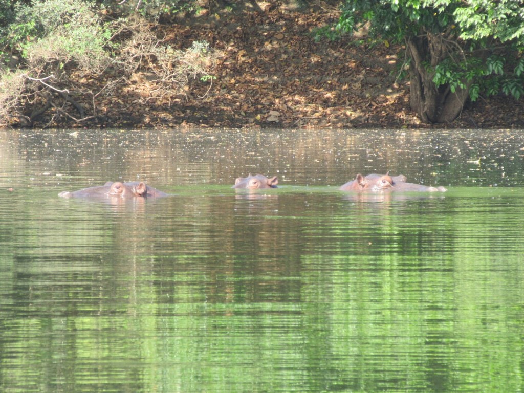 Eventually we came to the spot where the hippos were and shut off the engine. They looked like hippos I suppose. There were at least five of them, occasionally putting their eyes and ears and nose above the water and giving us a hard look, in the way that hippos do. In return, we stared back. Our guide told us these were regular hippos instead of pygmy hippos. They looked pretty small to me but upon review of various photos online I suppose the pygmy hippos have more rounded and less angular faces.