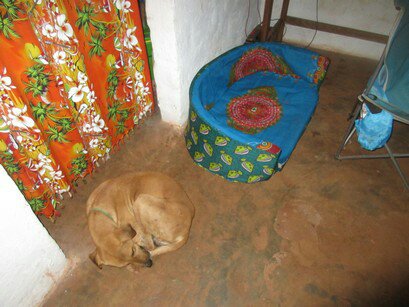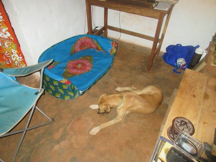 He was also, until recently, afraid to hang out inside my hut. When there was food on the line, he would forget this taboo and hang out under my armpit until he could lick the bowl, but otherwise he was afraid. When a rainstorm hit a week or two ago I lured him inside with a dog treat and closed the door. I didn’t want him to be wet and cold. He stood around nervously, until I scratched him behind the ears enough until he fell asleep. That changed something I guess and now the mutt rolls in like he owns the place. At night he departs to do whatever he does at night, but he’s scratching at my door at 0500 asking to be let in. So what do I do, since I am so kind and generous? I built the dude a dog bed. I went into town, bought foam and chitenge, and slaved over a needle for hours sewing him what I am willing to say with some seriousness is probably the most comfortable dog bed in all of Mbala District. Does he use it?