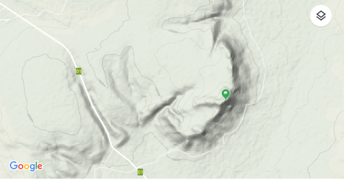 I got to the mountain at about 1100. As you can see from the map above, there is a long stretch of road that goes downhill to the base of the escarpment. At the top of that hill, I started poking around for a road visible on Google Maps that brings you like part of the way to the mountain. I poked around and didn’t see it, and I continued down the hill. Looking into the forest, the bush through which I would have to whack looked pretty thick and difficult to whack, and since I couldn’t find the road I was looking for anyways I continued down the hill, figuring I would just go with the eastern route.