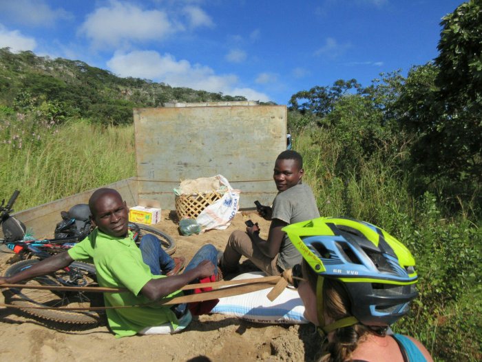 Lucky for us though, about halfway up the path a canter came by and agreed to give us a lift. They were carrying sand to a farm down the road, and the guys in the back were pretty friendly, especially after I coughed up five kwatcha for some booze. They took us another 20km or so down the road. There was one moment that really had us worried though; we said we were going to Izi Falls and at the point where we thought we should get off they told us to stay on, and then took us off the main road down a path I did not recognize. When you are trying to navigate unnamed roads via Google Maps Satellite images though, it’s hard to recognize anything, and in the end it turns out they were right. Our canter ride came to an end after another 5km or so at the canter owner’s farm. He offered us lunch and to store our bikes for us, but we were anxious to make more headway and afraid to leave our bikes with him. We probably should have taken him up on both counts.