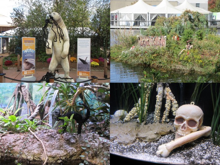The biggest takeaway from the day was actually that the Mystic Aquarium is super into Halloween. There were Halloween decorations everywhere. The polar bear at the front had a giant spider in its mouth. The majority of the fish had to contend with new neighbors in the form of skulls and skeletons. There was an entire skeleton island in the marsh, and the rain forest exhibit featured incongruous pumpkins and unfortunately congruous black cats. Do they buy new stuff every year, or does the Mystic Aquarium have a gigantic warehouse of Halloween decorations stuffed to the gills 11 out of 12 months in the year?
