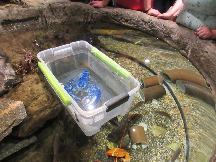 Unfortunately, there were just too many people, so we called off the heist for right then and decided to see the rest of the aquarium. After the penguins and the marsh, the rest of the exhibits were indoors, which we braved out of a love of sharks. I think I failed to take any good quality pictures of sharks, but I did take this photo of a blue lobster which, I am told, is very rare, and must also be a criminal, relegated as he was to an individualized jail. Poor thing.