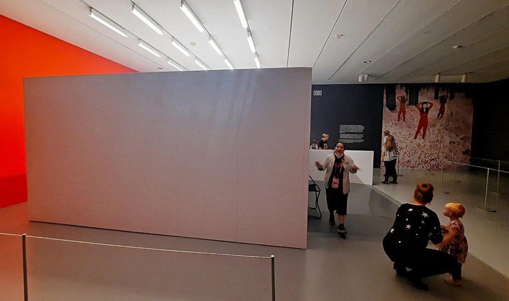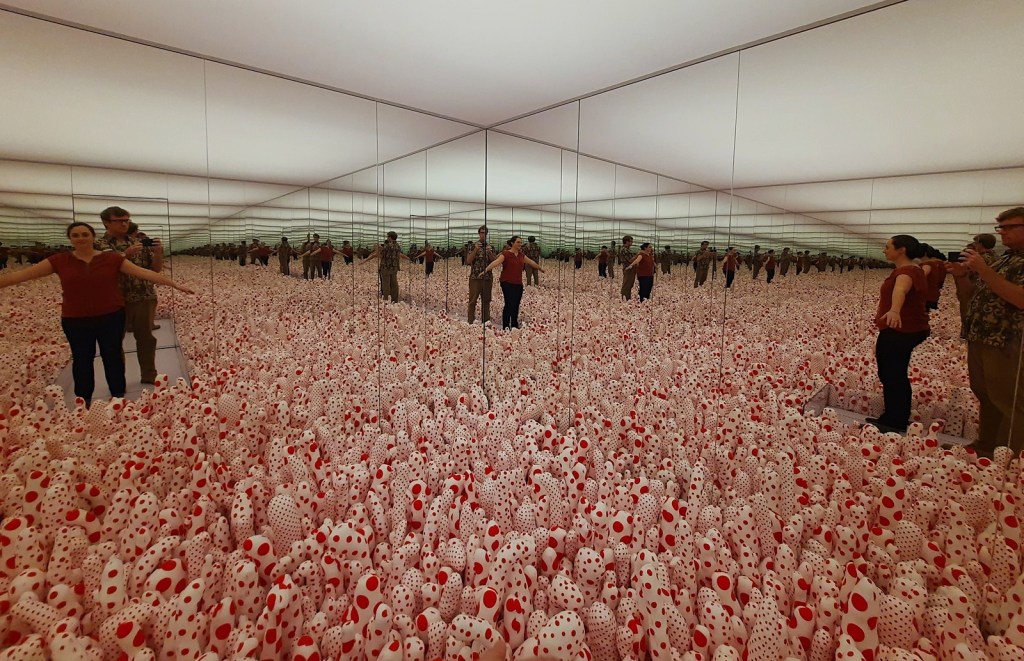 It was a much smaller exhibition than I had thought given the density of instagram photos, but the major things on display were the pumpkin at the top (titled Pumpkin) which was very nice and vibrantly orange, and then the two other big things were infinity rooms. My first observation is that infinity is pretty tiny, fitting nicely as you can see into a large box of a small room with a door and a short pathway for you to enter. You are not allowed to bring bags or unworn coats inside, but there are cubbies for your convenience. There were not that many people in the exhibit the day we arrived so the Disney-esque lines they had set up were not really in use, but each group of two adults max got to see the art for 30 seconds. This was an interesting way to experience art, in regimented 30-second chunks where you are shut into the box that is the art with just yourself and your one other adult. I don’t think this was part of Kusama’s intention but it was a lot to fit all the desired contemplation into so short of time.