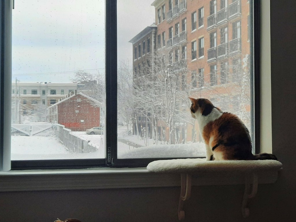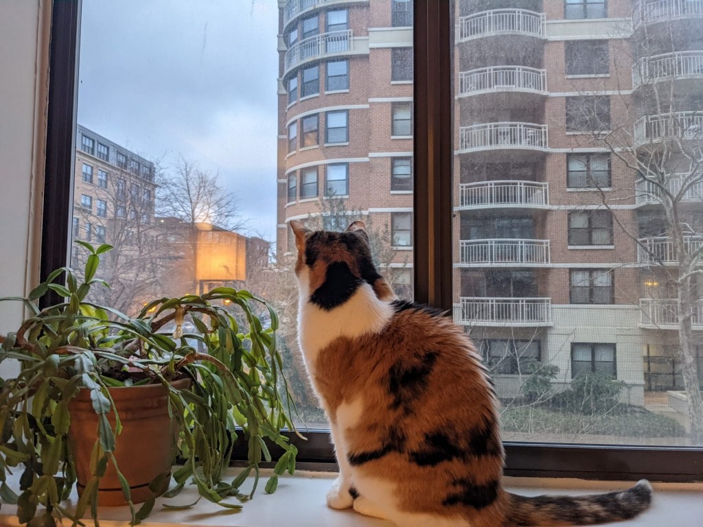 She is doing quite well! Back when I wrote the first post we had only had Tink for like a week or two, so although our love for this perfect cat was pure, it was young. Now, with the fullness of time, we have learned so much about Tink’s personality and habits. Some things haven’t changed. For example, in the last post I waxed on about how much she loves windows. She still loves windows! Her usual habit these days is right after breakfast she hops up onto the windowsill in our bedroom (pictured below, the one above is the office) to watch the birds out there. That is the prime bird-watching location because there is a tree underneath and so there are lots of birds to watch. Having been inspired by none other than the New York Times, we occasionally put cat TV on for her, which she seems to appreciate. The advantage of cat TV is she can watch it from the couch instead of the hard windowsill. She still prefers the windowsill, and gets grumpy if we fail to open the blinds for her, but it’s nice that there are options.