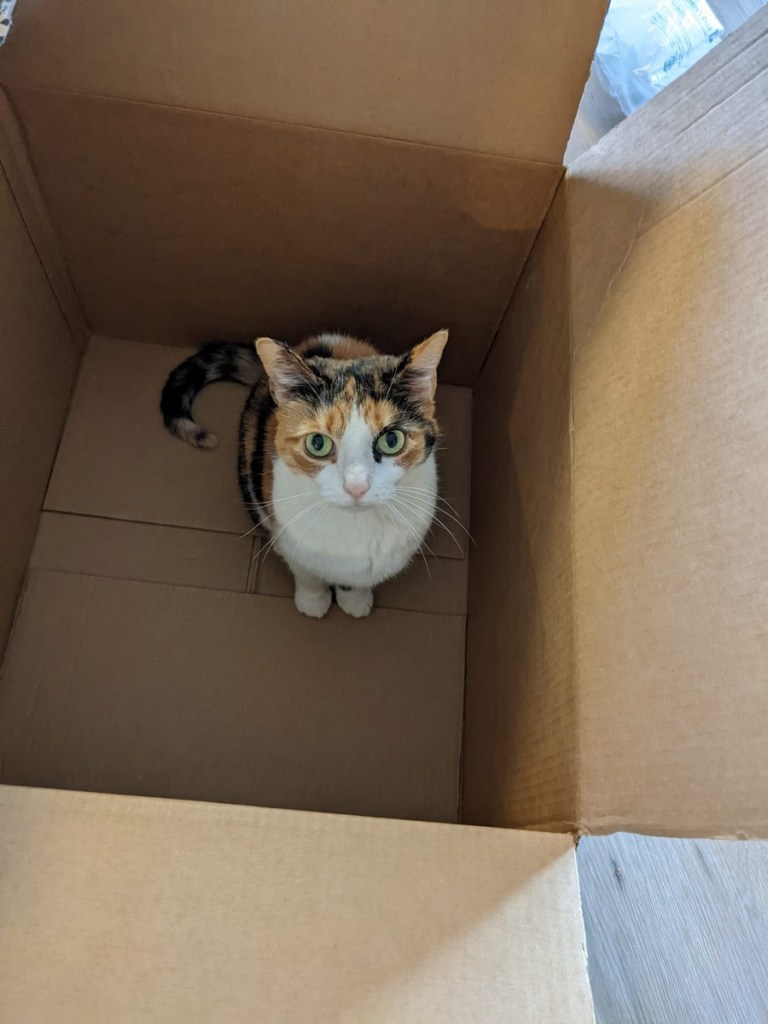One place Tink has made a lot of progress is in becoming a lap cat. Tink, who I will remind you is perfect, is not the world’s most cuddly cat. She enjoys the new perspective on the world getting picked up brings, but once she has verified that all the books in the bookshelf are still in place and there is still no likely way she is going to be able to get up there, she is ready to be put down. However, she has warmed up to the notion of cuddles. You will remember from the last blog post that she liked sitting on pillows. If you make yourself particularly pillow-like, she is, on occasion, willing to climb on top of you and knead you a bit and, if you are very very lucky, settle in. A good alternative to this process we have come up with is to lay down next to her and act like it was her idea the whole time to cuddle. If you catch her in the right mood, she’s delighted to play along: