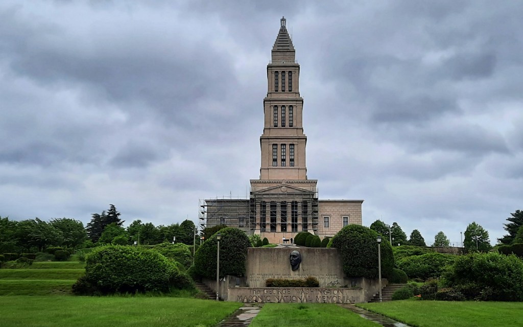 The tour was led by a very nice man who was himself of course a Mason. During the course of the tour you go higher and higher up the temple, which focuses on being tall. You go higher via an elevator which is cool because it actually goes up at a 7° incline because it is at the edge of the tower and the tower goes up at an (on average) 7° incline. Beside the entry hall there is a recreation of the Masonic Temple room that was formerly housed in the Alexandria city town hall (across from Gadsby’s Tavern, where they also had some meetings). This is where a lot of these George Washington artifacts are. On the next floor up there is a room full of neat Mason costumes, and above that is where most of the Dead George Washington artifacts are, and then also a bust, a statue, and a painting of George Washington, all staring at each other more or less. Finally you ascend to the tippy top floor, where you can go out and see the views. We were also blasted by wind but that added to the charm.