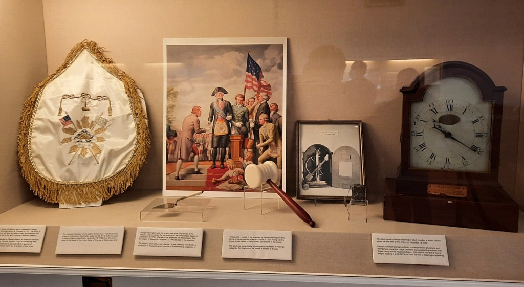 - The clock that was in the room when he died (above picture, far right; they disabled it to mark the time of his death, leaving both a morbid memento for Mrs. Washington and also ruining her clock? She gave it to the Masons)