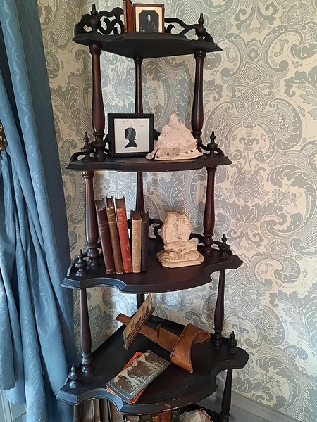 Besides the conservatory, the tour takes you through her dad’s office, which had a lot of neat furniture and a selection of the books she owned (the originals are at Harvard, apparently), to the entryway which had a very neat shellacked canvas floor covering, and into the parlor where the Dickinsons entertained guests and did other parlor-type things. There the tour also highlights the people who labored in the house, both Black and Irish servants. From there it is upstairs where there is a short lecture with some fun visual displays that talks about how Dickinson labored over the word choice in her poems and how she never titled any of them. An interesting perspective into an artist’s work. Apparently they date some of her poems by her handwriting. A particular highlight of our tour is there was a brave little boy who got volunteered to man a lot of the visuals and also play the piano in the house. A very talented fellow, that kid.