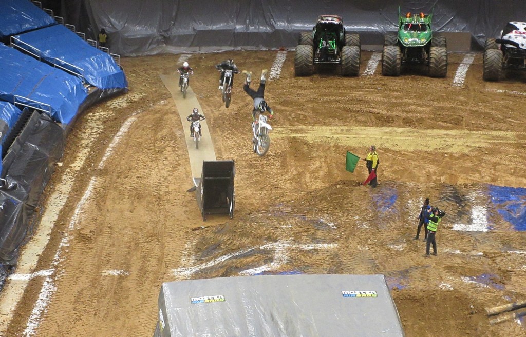 But yeah anyways the point is that Monster Jam was awesome!!!! They started off by racing around and that was really cool, and then they had the coolest event of the night which was all about two-wheel tricks, like wheelies or even making the Monster Trucks stand on their nose which was extremely impressive! I mean seriously the things they make those trucks do can’t be easy, even when you have all that torque. The technical skill is what impressed us the most, but maybe my fiancée and I are not the typical Monster Jam fans. But maybe we are! There is art in any endeavor in which you put your time and effort! Also at halftime they had motocross which was also very impressive and undoubtedly actually vastly more dangerous (no rollcages on these bikes):
