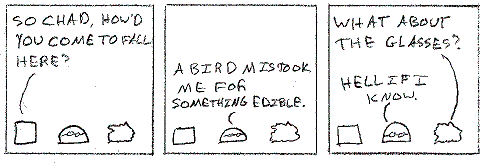 Finally, smack dab in the center, is Chad. Chad is semi-circular, and wears glasses. Where he got the glasses, no one knows, but he wound up in the bunch after a bird mistook him for something edible. Plus, with a name like Chad, you can’t go wrong.