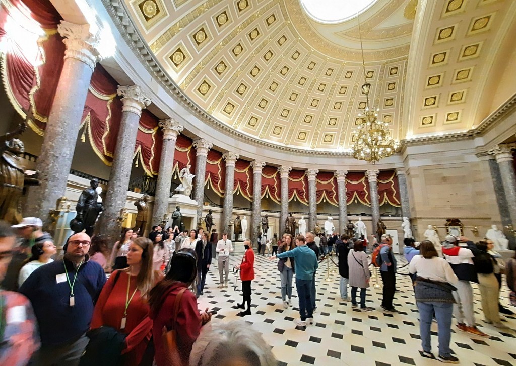 There are two major points I want to make about the Capitol tour, the first more general and the second more specific. As we continue to view all these sites important to the U.S. historic canon, it is increasingly a little bit weird to me the specific sorts of things and time periods we elevate. And more specifically how we like to keep them absolutely stuck in these particular moments in time. Both the White House and the Capitol were built in the 18th century, and as far as the public tour goes at least both are mostly monuments to themselves. The Statuary Hall used to be the House of Representatives, and the tour guide informed us that in a structurally questionable decision the original and literal House floor is preserved under the current marble. Into that marble are plaques where former Presidents sat when they were Representatives. Like I said the intro video to the tour is as uncritical as you can be, using scenes of Congresspeople chatting amongst themselves to portray an unbroken line of thoughtful, critical debate of laws on their theoretical merits. But what do you get when you crystallize and elevate all this as the core memory of American society, to the near exclusion of the next two centuries of development? The peaceful, independent, agrarian society that Jefferson dreamed of but which never existed becomes the norm and everything else – the lived America of the vast majority of its citizens – is a deviation that can and should be corrected. It gives a concept like Originalism moral weight as though divining the intentions of white enslavers for a society they could not have conceived is a good thing to do. Every time I see these set pieces I think we need new monuments so we can let the old ones whither.