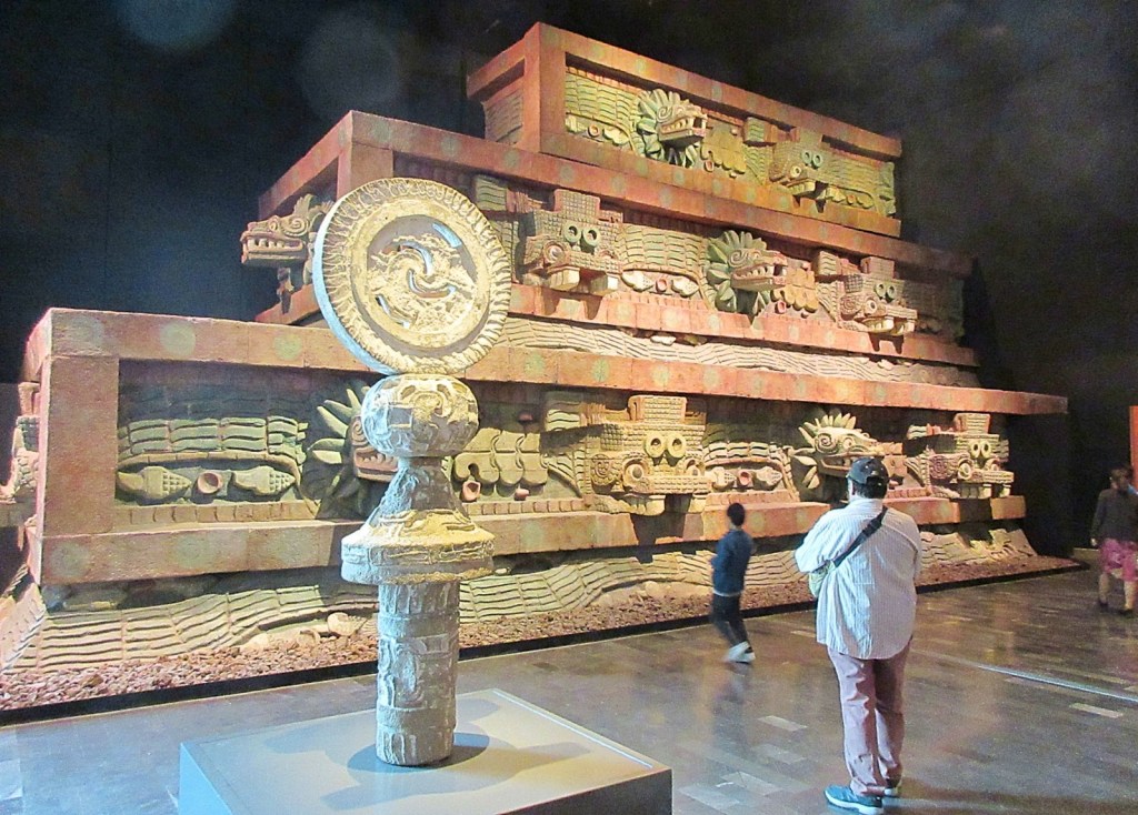 We got to the anthropology museum fairly early but it was quickly brimming with people. After the entryway it opens up into a massive sunny courtyard anchored by a gigantic fountain, though with the water spilling from above the effect was (for the better) more mountain waterfall or perpetual rain. The place was fairly overwhelming, a sense which was ameliorated by the fact we couldn’t read most of the signs. It separates itself into different sections based around separate cultures, and we were glad to see a whole section on Teotihuacán, which we had planned to visit the next day. The museum is really well put together, and you can weave inside and outside the building to see artifacts and recreations of temples and sights. That made these cultures feel more alive than if it was just pots in display cases. The museum is also where you will find some of the more famous icons of Mexican culture, as experienced from the United States anyway.