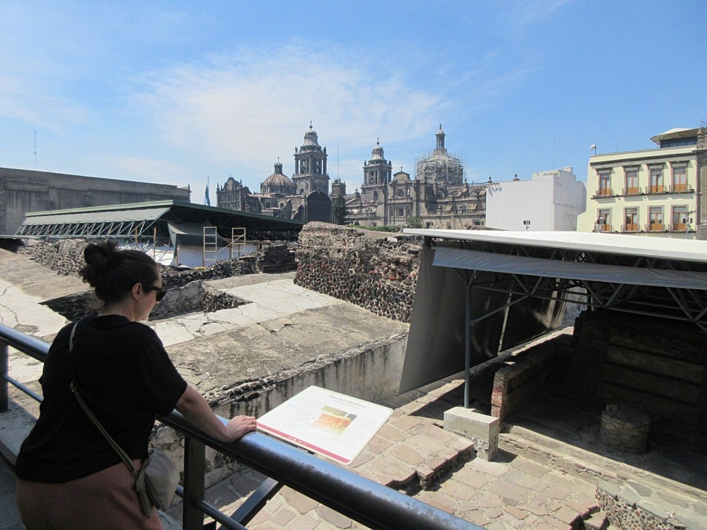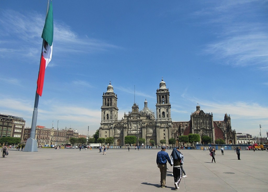 Per our request, our Didi dropped us off at the Templo Mayor, except (per our unfortunate instructions) we were at I think the back of the complex, right on a very very busy street full of shops. I know I wax and wane about the everyday commerce of ancient cities, but Mexico City is an ancient city and people must have been doing their shopping on this very spot for centuries and centuries. This is a thought I shared with my super amazing wife, and she appreciated it for what it was, but did not appreciate it for what it wasn’t, in that it wasn’t me trying to figure out how to get us off this busy city street and to our intended destination. So we walked and saw the backs of more impressive buildings, such as the Palacio Nacional. Our attempts to see the fronts of these buildings were thwarted for quite some time due to all the streets that were closed on account of recent and pending protests, but finally we stumbled out onto the Plaza de la Constitución.