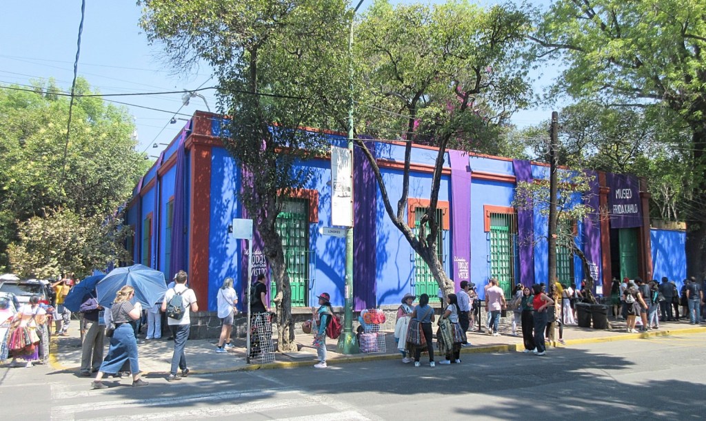 Our next stop was Casa Azul, which was the opposite of Trotsky’s journey. As the New York Times laments however Casa Azul is very popular and our timed tickets weren’t for a bit, so we talked the fairly short distance to downtown Coyoacán to enjoy the neighborhood. It is easy to enjoy! There is a beautiful park and a fountain with some coyotes and a market we wandered through and we couldn’t have spent a nicer hour or so until it was ticket time. While wandering down there we also saw an industrial tortilla machine in action and I want one now. But off we were to Casa Azul.