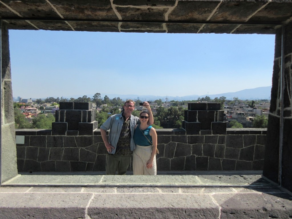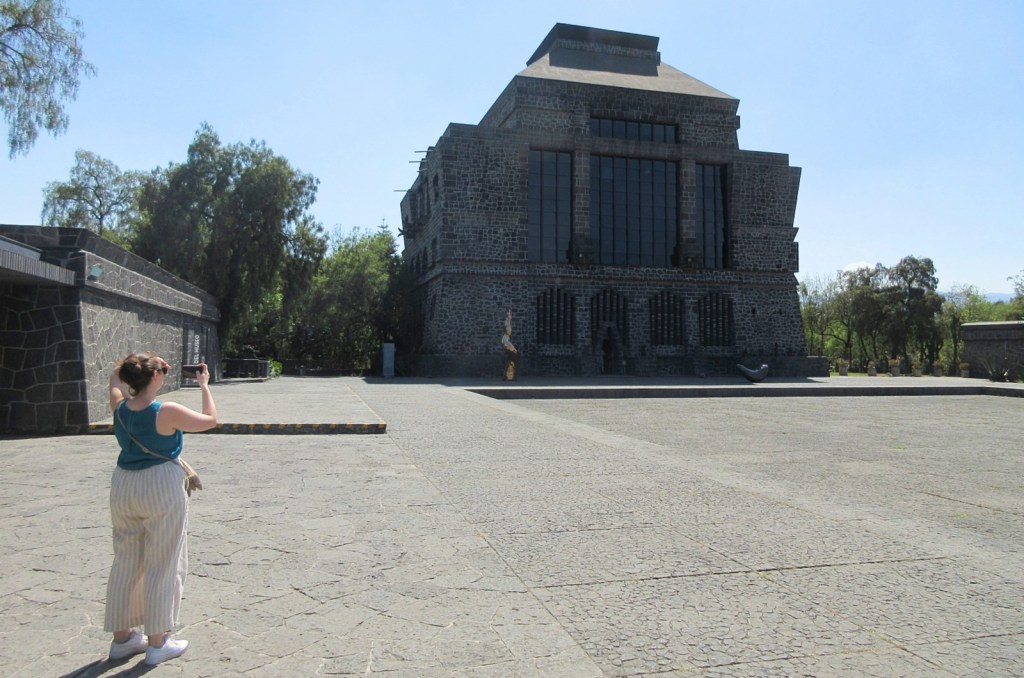 But that brings us to our final destination for the day, Museo Anahuacalli. There are no edges sanded off of that place. It is a taxi ride away from Casa Azul and out of the leafy center of Coyoacán. Anahuacalli is Diego Rivera’s monument to himself and it is monumental. You enter the gate and it spits you out onto a black stone courtyard in the blazing sun devoid of green and loomed over by the pyramid of volcanic rock that is Anahuacalli. Rivera built it with a very particular vision and as you enter you are thrust into darkness, with the light filtered through translucent stone. The pyramid is filled with Rivera’s collection of Mesoamerican art and artifacts. The collection is huge and impressive but sad for being ripped from its context. There is little in the way of explanation for any of the objects. You can descend a level into Rivera’s temple underworld but then as you start to climb up the pyramid things get brighter. There is a huge room (with gigantic pictures of communists, and throughout the pyramid mosaics of communist symbols; these people we visited today really liked communism) and at the top you can go outside to beautiful vistas of the Mexico City landscape. Well worth the visit for that alone.