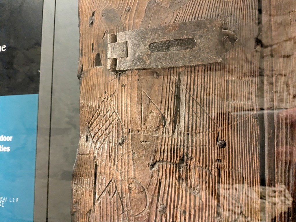 I think the coolest bit of Edinburgh Castle is St. Margaret’s Chapel because it is the oldest part. I had remembered it from my previous visits in Middle School, and you know what it was about the same. I was surprised though at how small Edinburgh Castle was; in my memories of the place I seem to have imported various bits of Stirling Castle as well. What surprised my super amazing wife was how not particularly dark and dungeon-like it was, as one might imagine a castle to be based on the movies (this was her first real-life castle). However eventually we went into the Prisons of War exhibit they had going on and that satisfied some of the dungeon itch. Edinburgh Castle housed various prisoners of war in the 18th and 19th centuries, including Americans captured either during the War of Independence or the War of 1812. One particularly cool thing they had was graffiti carved into the door depicting an early version of the Stars and Stripes. I think I saluted it.