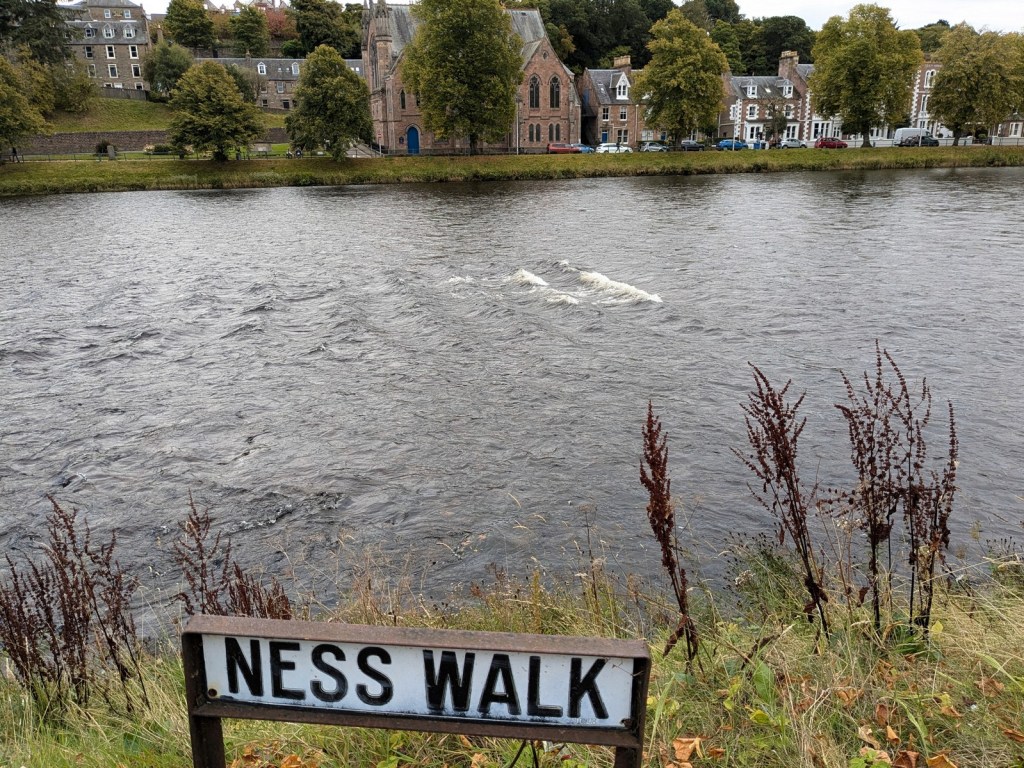 The next morning we awoke and had a massive breakfast, strange only because we had it at Wee Wild Pancakes. My super amazing wife and I both had “Banoffee Pie,” except her in crepe form and me in pancake form, though neither of us could finish it. What we had anticipated being a slow day was unfolding ahead of us, so we did some low-key Inverness sightseeing, checking out the Kirkyard (upon review of that article man that place is ancient!) and then taking a walk up the River Ness. That seems like a very nice little river. As we walked around my super amazing wife kept spotting mini-Nessies (cormorants) until eventually we came to the finish line of a marathon, and spotted Nessie herself!