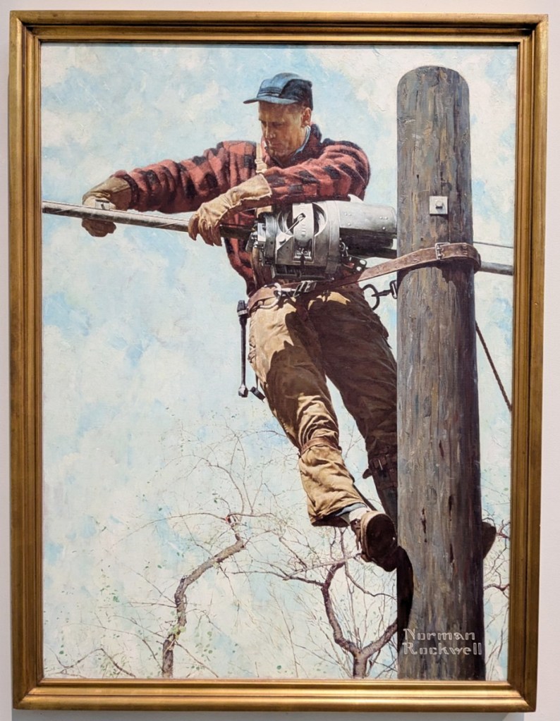 The man was pretty amazing at what he did, which you don’t need me to tell you. A couple other pieces I really liked were “The Lineman” and “Glen Canyon Dam.” Neither of these were for the Post. I like “The Lineman” because there was apparently a lot of technical back and forth. It was for AT&T and since Rockwell worked off of models or reference photos he enlisted one John Toolan to pose for him on a “makeshift pole supplied by the telephone company,” and then when Rockwell sent off the preliminary drawing AT&T had him make nearly a dozen changes, mostly technical, which just like, some group of engineers spent a lot of time pouring over the drawings lest some inspirational ad be inaccurate. On the other hand “Glen Canyon Dam” caught my eye because it is kinda 3D; I don’t think it’s impasto exactly but the ridge the family is standing on sticks out from the canvas, and all those little rocks are actually bumps that you could feel, if they let you, which they don’t, the cowards. The painting itself clearly tells quite the story but I just think its neat.