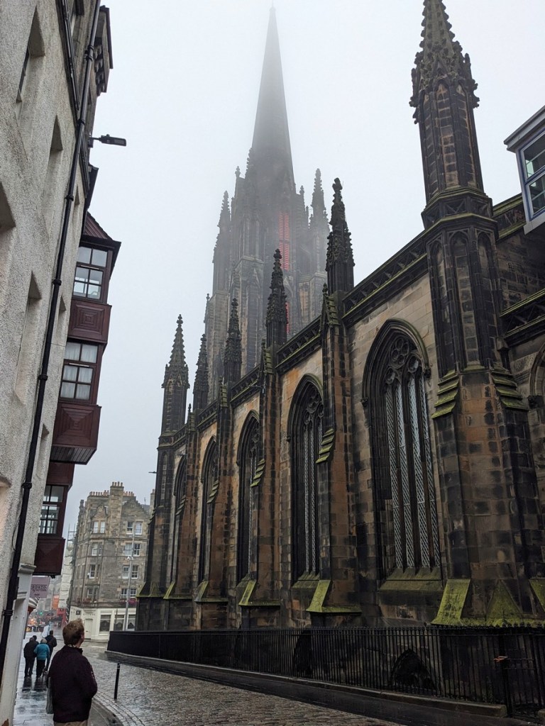 After dropping our bags at the hotel we set out for the day’s adventures, which with our early arrival on the Caledonian put us on the streets of Edinburgh at about 8 in the morning. And what a morning in Edinburgh. Misty, foggy, and very atmospheric. It was early enough that almost nothing was open but we had the Royal Mile nearly to ourselves. We took in the sights and did some window shopping and eventually settled into a café to kill some time. Fortified, we spent the largest chunk of the morning hiking through greater Edinburgh to do some shopping, stopping by Topping & Company and Kathy’s Knits and The Gently Mad, where I once again was somewhat disappointed at not finding the exact bits of London Mission Society ephemera I had imagined would just be all over Edinburgh. Oh well. On our way back to the Royal Mile we enjoyed a hot chocolate at The Marshmallow Lady.