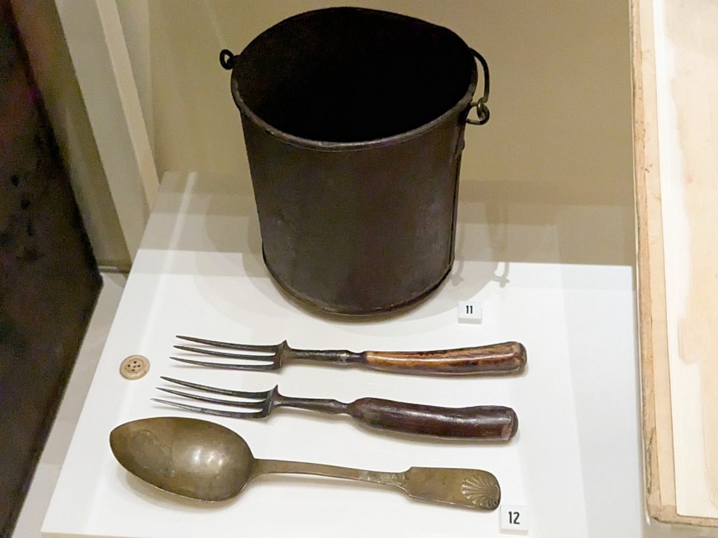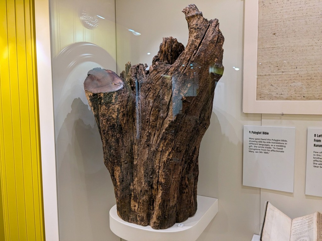 Throughout they have some interactive displays clearly meant to appeal to a slightly younger audience, but overall it is a really in-depth and serious museum about David Livingstone’s travels and impact, with special focus on the people that helped him along the way. They do this through what is an astounding array of artifacts. Like George Washington, David Livingstone was clearly the sort of person that inspired admirers to collect relics. Many of these relics were clearly put in the museum to appeal to me, specifically, like various navigation instruments that Livingstone used. But I mean they go deep. They got a chunk of the tree under which he proposed to his wife, Mary Moffat. They got a chunk of David and Mary’s house in Kolobeng. They got David’s forks and spoon even, and they have the very shirt that Livingstone was wearing when he met Stanley. They got everything.