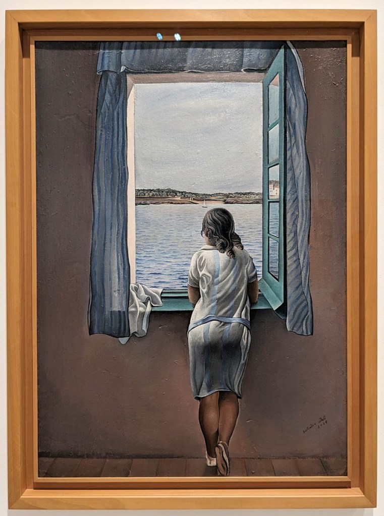 I did enjoy the exhibit on Picasso (I learned he sculpted in addition to his other work, I don’t think I knew that before), but I think the first thing I was really stunned by was the Dalí above. We of course have a long history with Dalí on this blog, so I thought I knew the man. But lo! Here was something new, a normal-looking painting. Reading about the painting on the internet I found out that the left side of the window is actually missing (for composition purposes), and so maybe that is the surrealist touch. Or maybe the surrealist touch is a surrealist painting a non-surrealist painting as a huge meta commentary on something something something. It’s of his sister, Anna Maria. Later on in the gift shop we bought another portrait (titled “Portrait“) of Anna Maria, so enamored were we with this part of the ouevre. (Do you think when Salvador told Anna Maria he was going to paint her, she was ever nervous? “I’m not going to have large spindly legs and be striding across a desolate landscape or something, am I, Sal?” “No, of course not,” says Salvador, with a wink, “I would never ever do that to you Ann.”)