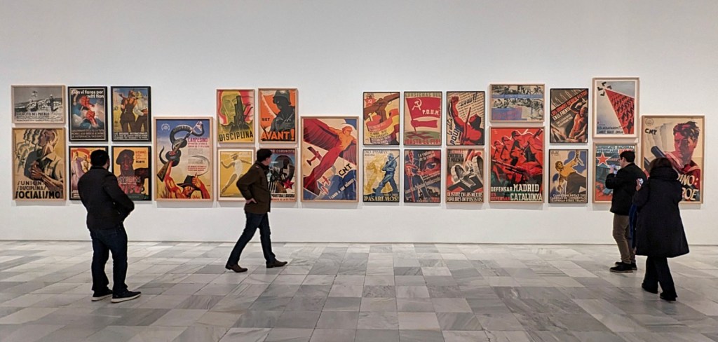 Speaking of the controversial, another thing hammered home in this museum for me is that context matters. Since the art in the Reina Sofia is more modern than the art in the Prado, I didn’t really know what was going on. I mean I’ve read Homage to Catalonia and I am aware that WWII happened, but the intricacies of modern Spanish history that so much of the art was responding to were rather lost on me. There was some people in the art world that will tell you not to read the label next to the art but when there are explanatory notes man do I find those helpful. But lacking those contextual clues I had to enjoy the below posters ONLY for the pretty colors: