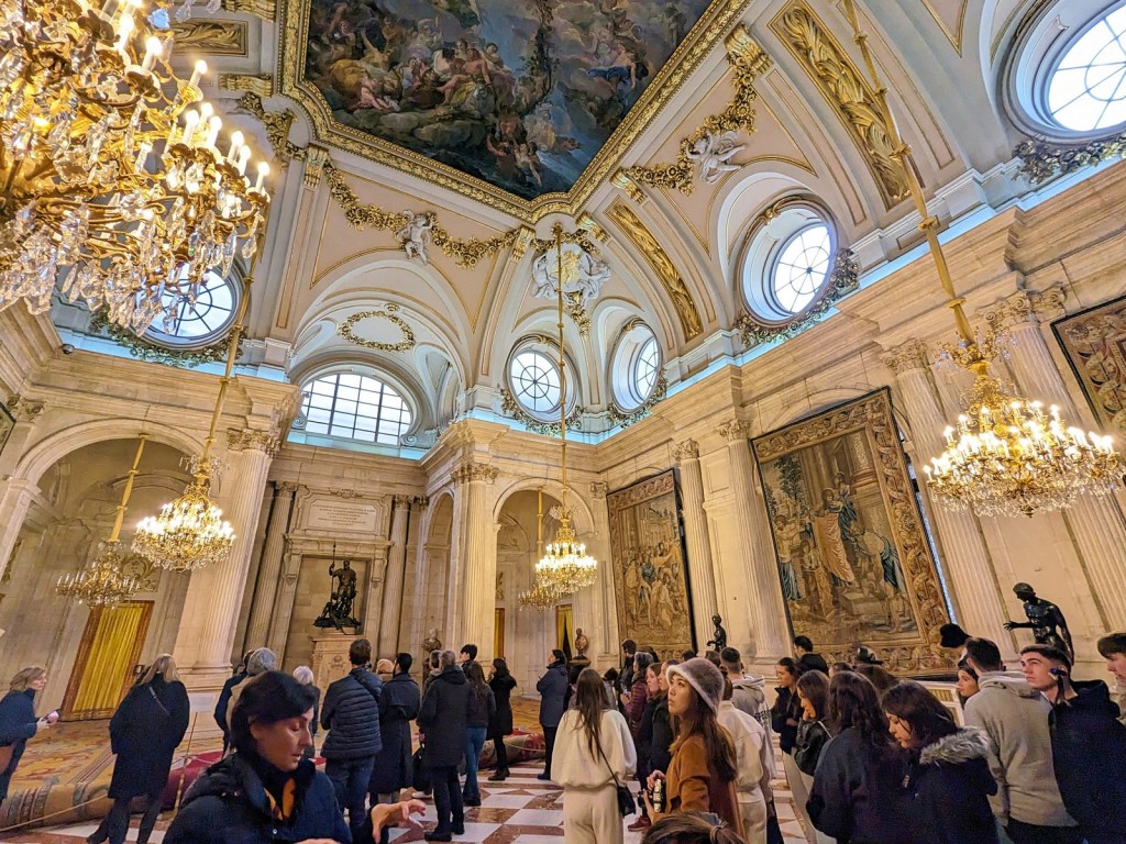 It was overwhelming. At some point you stop processing the splendor because it just keeps going. According to our tour guide the palace has 3400 rooms (twice as many as Versailles, they say), and I think the tour includes like 15-20 of them. Still a lot! Despite the lack of pictures, I tried to take notes. First thing is the clocks! They like clocks. The palace has 700 of them apparently, all of them working, the tour guide was proud to point out. I spotted at one point a clock endtable, like the entirety of the table surface was a giant clockface (behind glass). Maybe it was a tea table and you could therefore make teatime jokes, or something. More stats: we saw a banquet table that could seat 144 people; apparently the Spanish use the French protocol (the Bourbons are Hapsburgs, or something, I don’t know, who put them in charge anyway). This means that the King and Queen sit in the middle, unlike the English protocol, where they sit at the ends. I’ll try to remember that if I’m ever putting together a seating arrangement for them.
