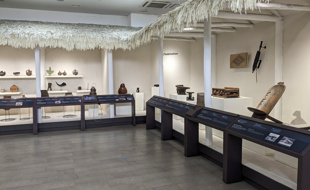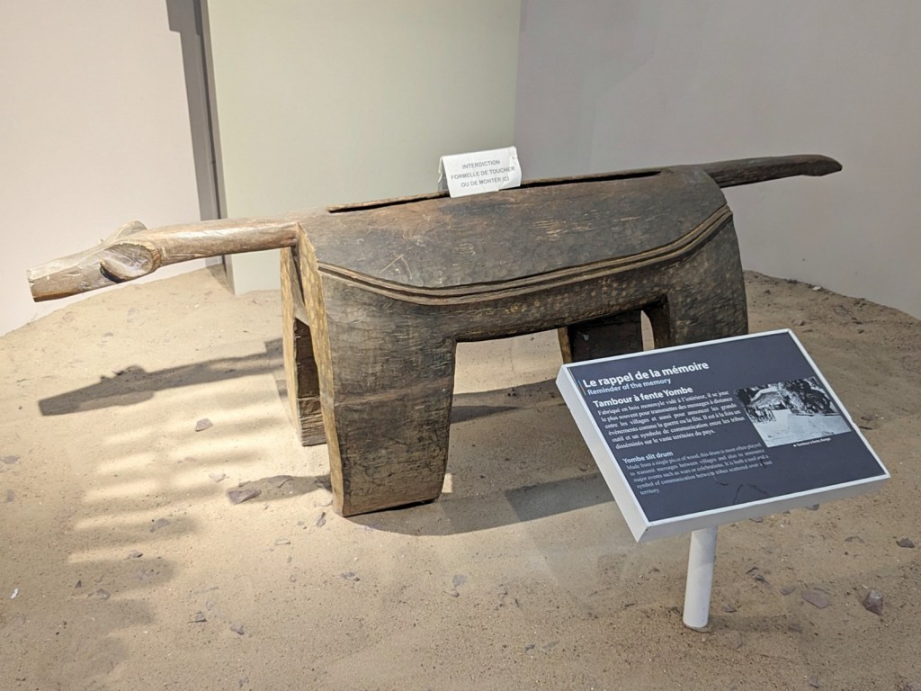 The museum is not terribly large but packs in a good chunk of stuff. There are several permanent and a couple temporary exhibits, arranged on two floors. Since the museum is new the displays are very well done with explanations mostly in both French and English. One thing that confused me is I couldn’t tell at first if different exhibit halls were open, as they are behind rather large sliding doors/walls. The exhibits are in fact open, it’s just that the exhibit rooms are air conditioned while the hallways are not, so they doors are keeping in the cold air. A lot of the items on display were familiar to me, what with having gone to the Royal Museum for Central Africa. One object that it took me a moment to realize was familiar was a Kakuungu mask, pictured below: