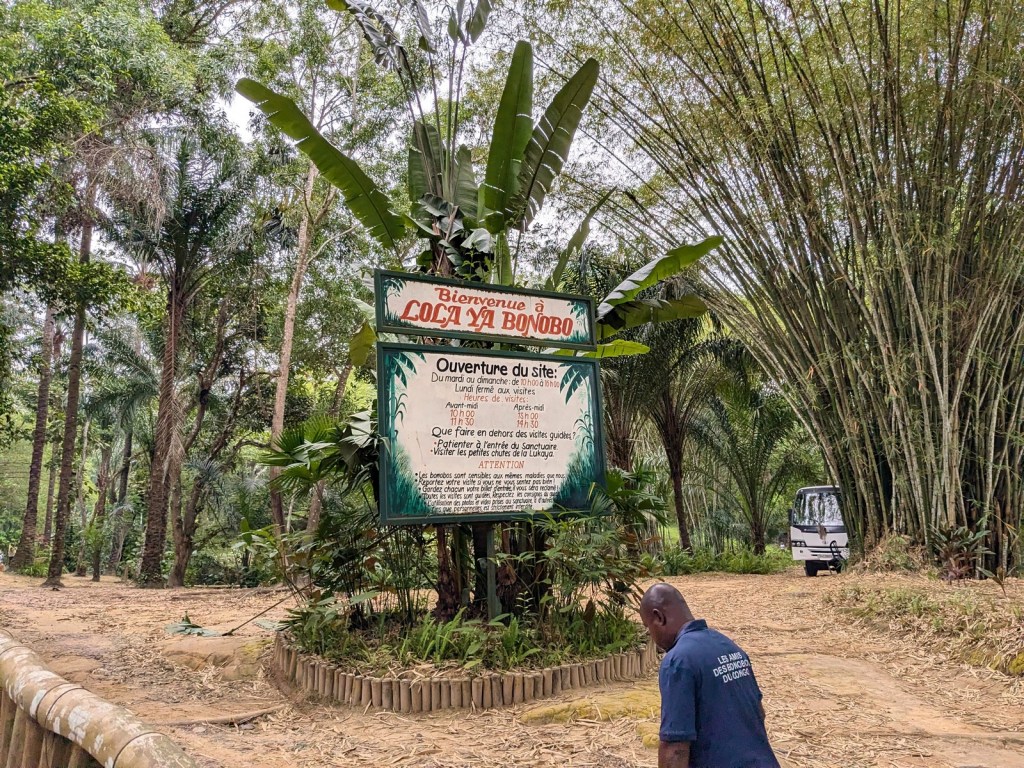 A little bit ago I once again found myself in Kinshasa, and this time the big adventure was going to Lola ya Bonobo! It was a lot of fun. Lola ya Bonobo is a sanctuary for orphaned bonobos. The name in Lingala means “Paradise for Bonobos” which seems fairly accurate. It’s on the outskirts of Kinshasa, which as the crow flies is not so far, but we are not crows, we are people, and we have to drive, and that means traffic, and so it is quite the journey out there. But pretty! The city center turns into suburbs over hills and valleys with pretty little gardens along the way and eventually becomes forest and you find yourself on the side of a small river in a copse of bamboo being offered drinks while you wait for the next tour time.