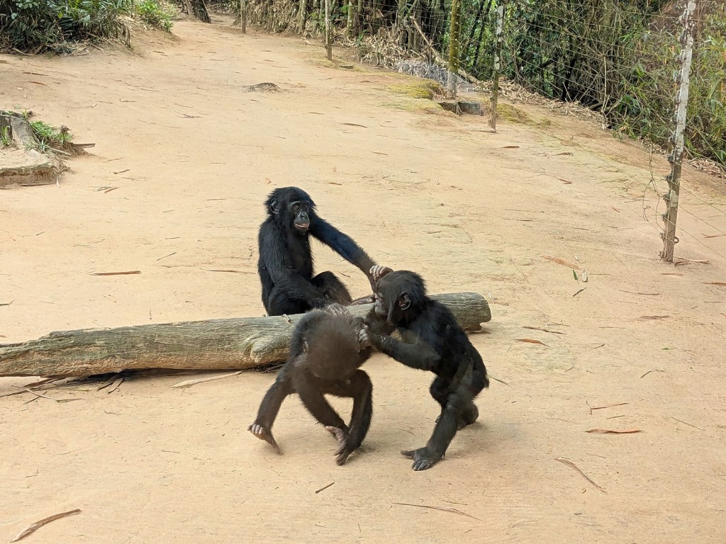 The first enclosure was the cutest because the first enclosure was for the baby bonobos. It was insanely cute. The babies are taken care of by “surrogate mothers,” i.e. some Congolese women who are looking after them. So we approach this enclosure which had a zoo-like glass front and there are just three women in there with baby bonobos clinging to them and then running around and playing and stuff. I imagine these women spend all day taking care of toddler bonobos and then go home and take care of toddler humans and man that must make for a full day. The babies had playground equipment including a trampoline and a swing but the best toy of course was the leaves on the side of the paths which the babies would push onto the paths and then the women would grab a broom and sweep them up. It was just like absolutely the cutest.