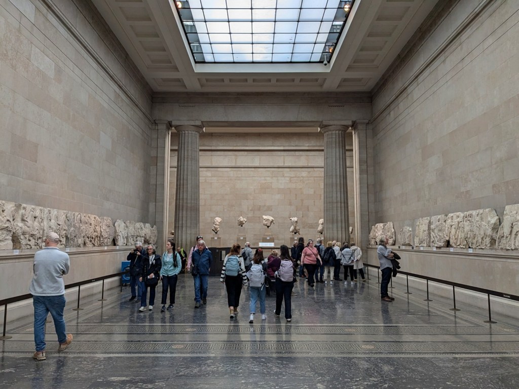 Because of other bits of our schedule this was a flying visit to the museum so we were really only there for the highlights. They keep the highlights conveniently close to the door though which is thoughtful. A quick left brought us to the Rosetta Stone where we oohed and aahed. The crowds weren’t quite what I hear they are for the Mona Lisa but I felt like the vibe was similar. The Rosetta Stone is larger than the Mona Lisa though and you can also see the back. Passing around the crown brings you almost directly to the Parthenon Marbles, where I showed off some podcast-acquired knowledge to my super amazing wife.