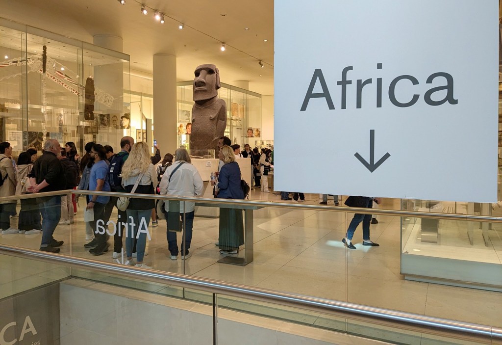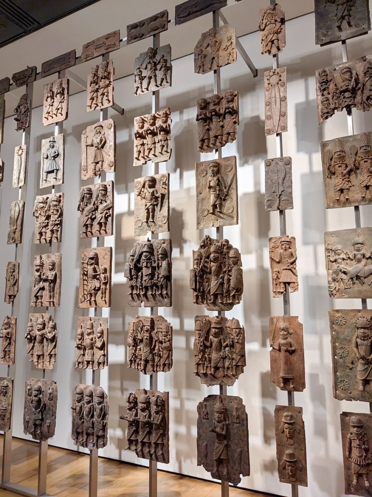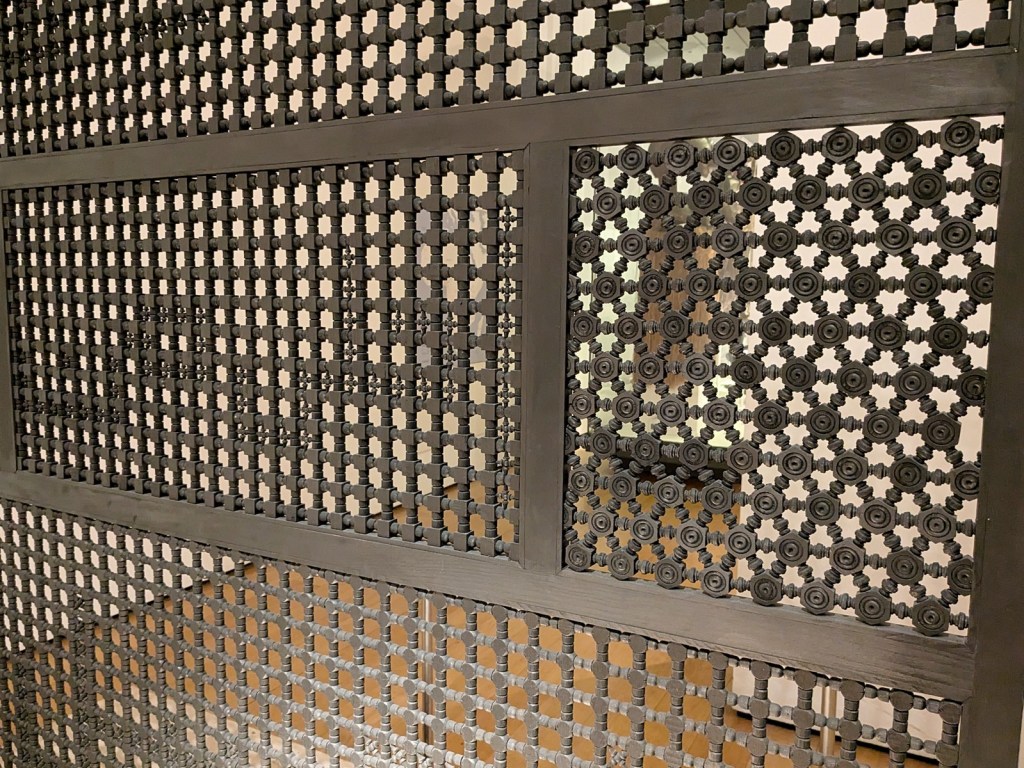 The major major major highlight for me was of course the Africa section, which I was somewhat distressed to learn was in the basement. On the way we passed Hoa Hakananai’a. I had thought the museum would have their samples of Rongorongo on display, but I was disappointed. I had to console myself with the phenomenal (and morally acquired) artwork they had on display. My super amazing wife was impressed by Tree of Life, a sculpture made out of pieces of rifles from Mozambique. Meanwhile I spent a large chunk of time admiring two Moko Jumbie figures commissioned by the museum from Zak Ové. I was really drawn in by the otherworldliness created by their wings before noticing how the use of new materials (like sneakers) manages to create an old-world object. And then finally in the commissioned artwork genre is “Knowledge is Sweeter than Honey” by Susan Hefuna, a really beautiful way to inscribe additional meaning onto the gorgeous carved screens the likes of which we saw in Andalusia and Morocco.