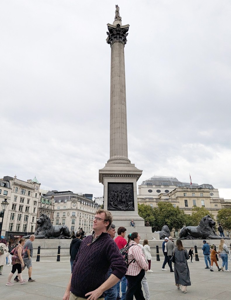 Although the rest of our day would largely bore you we did at one point drop on into The National Gallery (I was going to make a joke about the realNational Gallery but I don’t appear to have ever written about visiting, maybe I am just not checking thoroughly enough, I’ve definitely been) where I was wowed by how impressively restored some of the artworks were, with color and vitality despite being 600 years old, but I didn’t take any pictures or write down what those works were so you’ll just have to take my word for it. But the best part of that whole experience was of course seeing Trafalgar Square, because who doesn’t love Nelson (I mean maybe the French and Spanish?) but here is me trying to be him, though with more arms: