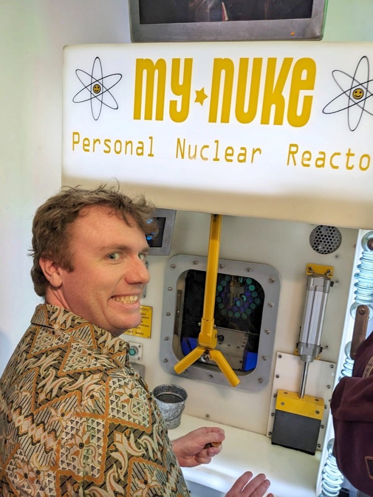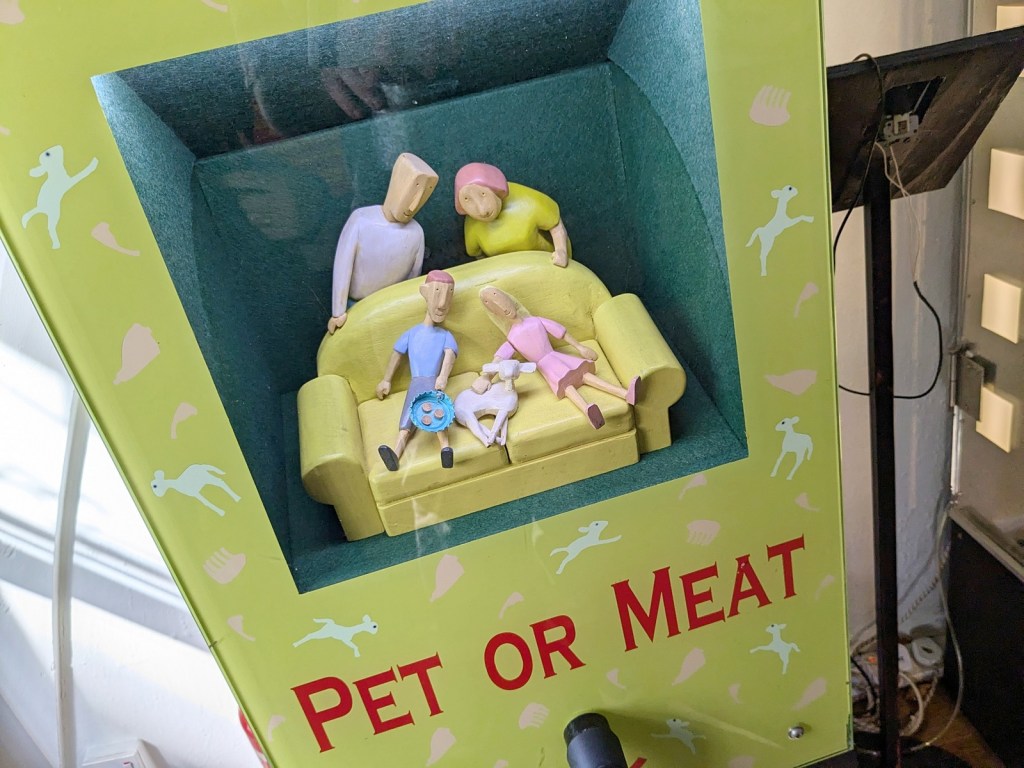 But once we got in there I think she was sold. It is a cramped, tiny little alcove of a shop but tons of fun. It was crowded when we got there (like eight or ten people inside) but I got us some tokens and we started playing games. Since I had seen the videos it was like meeting celebrities in real life. Right inside the door was the game that my super amazing wife was most enamored with. She is, as discussed many many times here, a big fan of sheep, so she had to have a go at Pet or Meat. We got pet! In retrospect I’m not sure which one she would have preferred. Meanwhile I played The Fulfilment Center and won a zero-hours contract, and My Nuke, where my extensive nuclear training did not come in handy and I dropped several fuel pellets and as a reward got some nuclear waste. Overall the arcade was super fun and I would totally host a birthday party there, which they note is one of the services they provide.