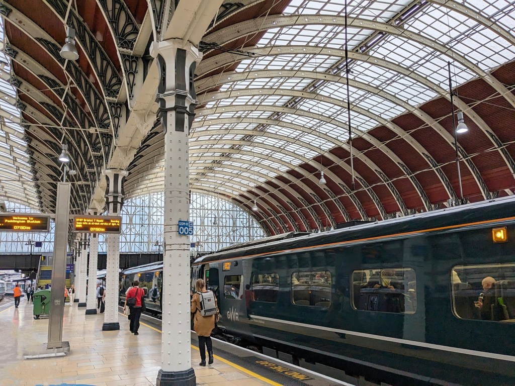 The tour ended at the gift shop, where I was distressed to learn that although they now have lapel pins, none of them said “Globe Theater” (I try to ensure my lapel pins say the name of the place I got them from), so I had to go with a cat holding a skull instead. You all will have to remind me where it is from. But with that bit of Elizabethan atmosphere absorbed, we head back across the river. There we took in some of our last sights of London, including fun things like Roman wharf timber and remaining bits of the Old London Bridge (conveniently both are in the same spot). It was important to absorb these things because the next morning we were off to the next big city of our vacation. So we tubed back to the hotel, had a good night’s sleep, woke up early, schlepped our too big suitcases through a couple of Tube stations not designed for too-big-suitcase-schlepping, and eventually arriving at Paddington. I had time to grab a sausage roll before we caught our train, which was a very nice ride. I was stunned to see we were going at over 110 miles per hour, but I suppose that sort of thing was just normal around there. But all the better because we were excited to finally arrive in the city of Jane Austen’s dreams: Bath.