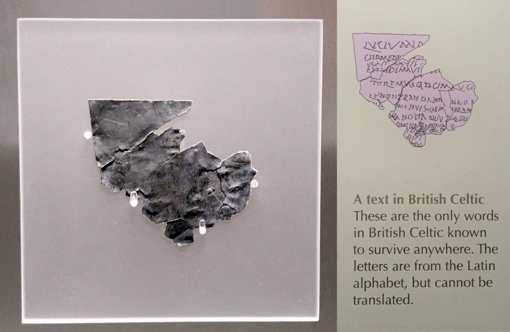 The museum really works to paint the long, long history of the site. Before the Romans showed up in 43 and built a big ole’ temple/spa complex on top, the hot springs had long been a pilgrimage site for the peoples of Britain. Which means that the museum has all sorts of artifacts from the Roman and pre-Roman eras. The second coolest thing they have in there are pre-Roman coins which I think is fantastic just because it is a glimpse into a whole strange and alien civilization. Plus some of the coins had boats on them. But that of course leaves the coolest thing, which had to be the only words in British Celtic known to survive anywhere. One of the uses for the springs was cursing people, and you could write your curse on a lead tablet and fold it up and toss it into the waters for the gods to take care of. They have in the collection one of these curse tablets written with Latin letters but in British Celtic. They don’t know what it means, because this is the only surviving record of the language and like, imagine that person. Speaking Celtic, but a) knows Latin and b) has a beef with someone they want the Gods to take care of. That is a person who bridged worlds.