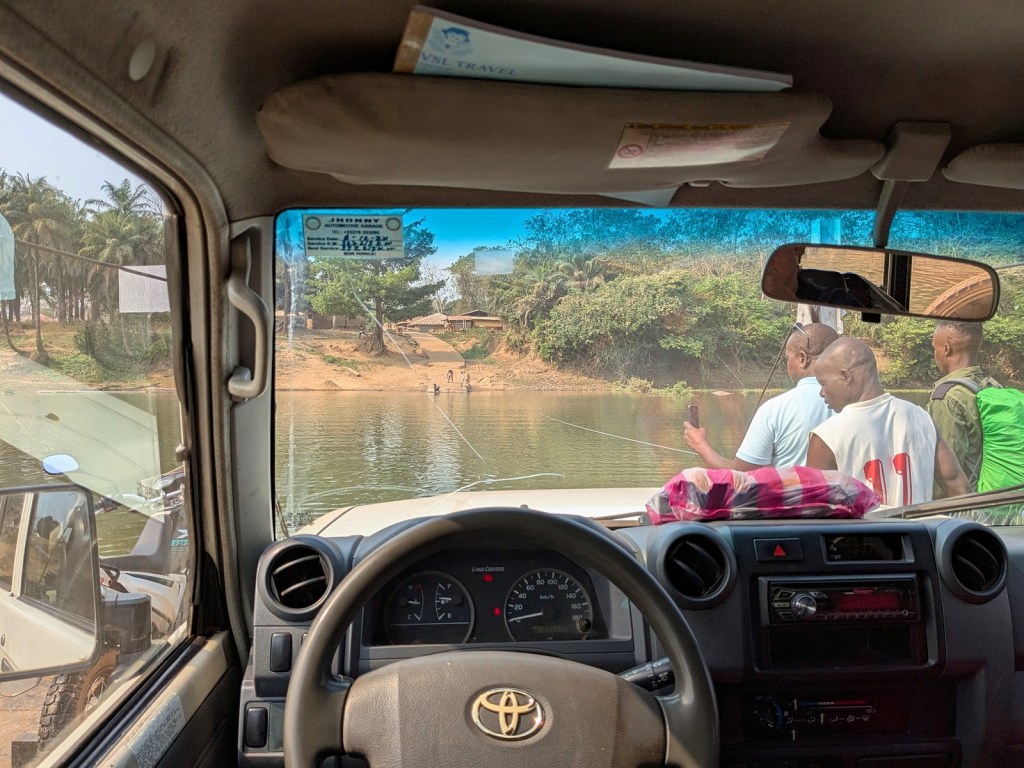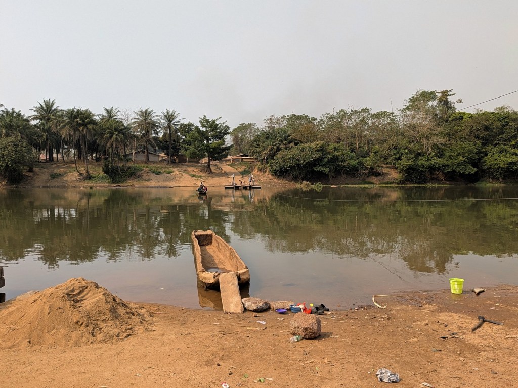 The final barrier to the park was the Little Scarcies River, which we had to cross by ferry. I thoroughly enjoyed this experience. I don’t know how old the ferry is or who built it, but it is a pretty nice system. It is attached to either bank by cable though it is entirely person-powered. The ferry was at the far side as we pulled up so we watched as it was pulled across to our side. On either end of the ferry there are ramps, and as another fun feature they are balanced so as one side goes down the other goes up. We drove onboard and were joined by a motorcycle and smattering of other people looking to cross. After boarding the man slowly pulled us across, and we had a very peaceful time floating over the river. Having not sunk, we drove the last few miles to the park entrance.