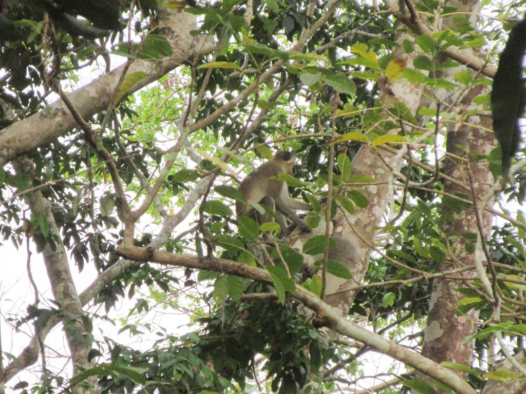 As everything was getting set up and unloaded our guides sent us off on our first park experience, a forest walk with the park rangers. This was pretty short. The park entrance and campsite I think are not actually quite in the park, but instead across the Kaba river. We never actually wound up setting foot in the park itself. I’m not sure if it was just inconvenient or if there was a deeper reason. Instead we skirted along the river to see what we could see. It was late afternoon and I think the rangers were worried about it getting dark. We spotted several monkeys traversing the trees. The rangers identified them as Colobus monkeys but having done some googling here I think they were actually Green monkeys. The most adventuresome part of the walk was crossing a stream via log (“local bridge,” the rangers said) but we survived dry and intact.