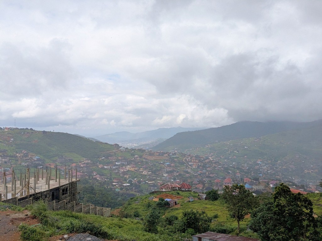 Since the viewing platform is still under construction, we couldn’t actually get to the very tippy-top of the mountain but a major advantage of the project already is that they have paved a very nice road that winds it way around the mountain. It’s got a lovely sidewalk which makes for an easy trip. And although you can’t get quite all the way to the top, the views are lovely nonetheless, the trip up providing a view in every beautiful direction of Sierra Leone.