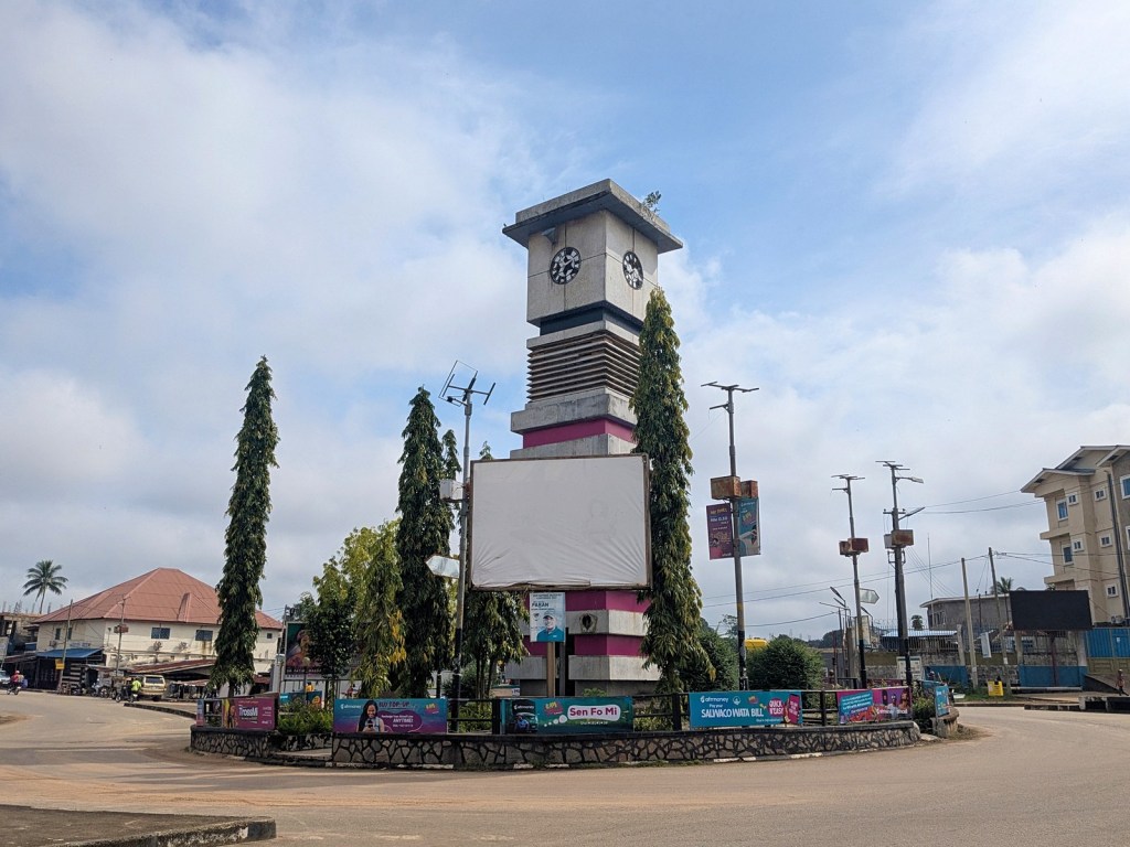 Having completed my early-morning tour, I left Kenema where the next stop was Bo so I could take a picture of that clocktower as well. Among the other sights I wrote down to mention were toilets cast of concrete instead of porcelain, and more strikingly a woman walking back from her bath at the stream, wrapped in a lappa as though she was returning from an onsen.