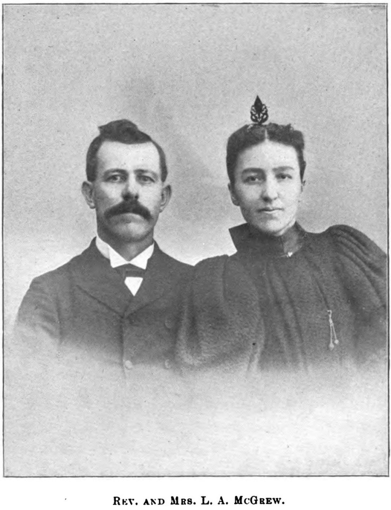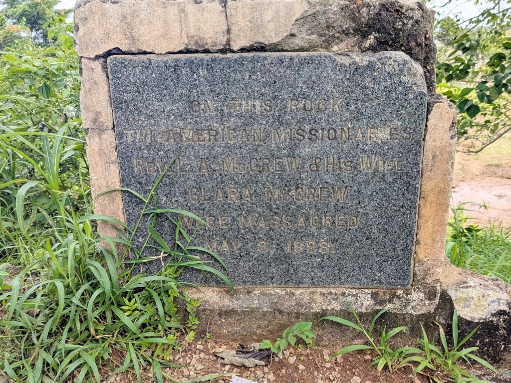 Later investigation (just today) has provided more detail than the plaque did. This is mostly from Mission Work in Sierra Leone, West Africa by the Rev. J.S. Mills, but Rev. Lowery Allen McGrew and his wife Clara B. (née McCoy) landed in Sierra Leone in 1896. They were sent by the Woman’s Missionary Board, which as far as I can tell was a Methodist missionary organization. Both Lowery and Clara were from Ohio. They wound up settling in Taiama, which seems to have been a bit of an outpost from their organization’s main station at Rotifunk. Trouble came in 1898 during the Hut Tax War. The rebels against the recent British colonial imposition killed the McGrews along with most of the other missionaries in the Sierra Leone Protectorate, the local evangelists, and their followers. A few more details are here and here.