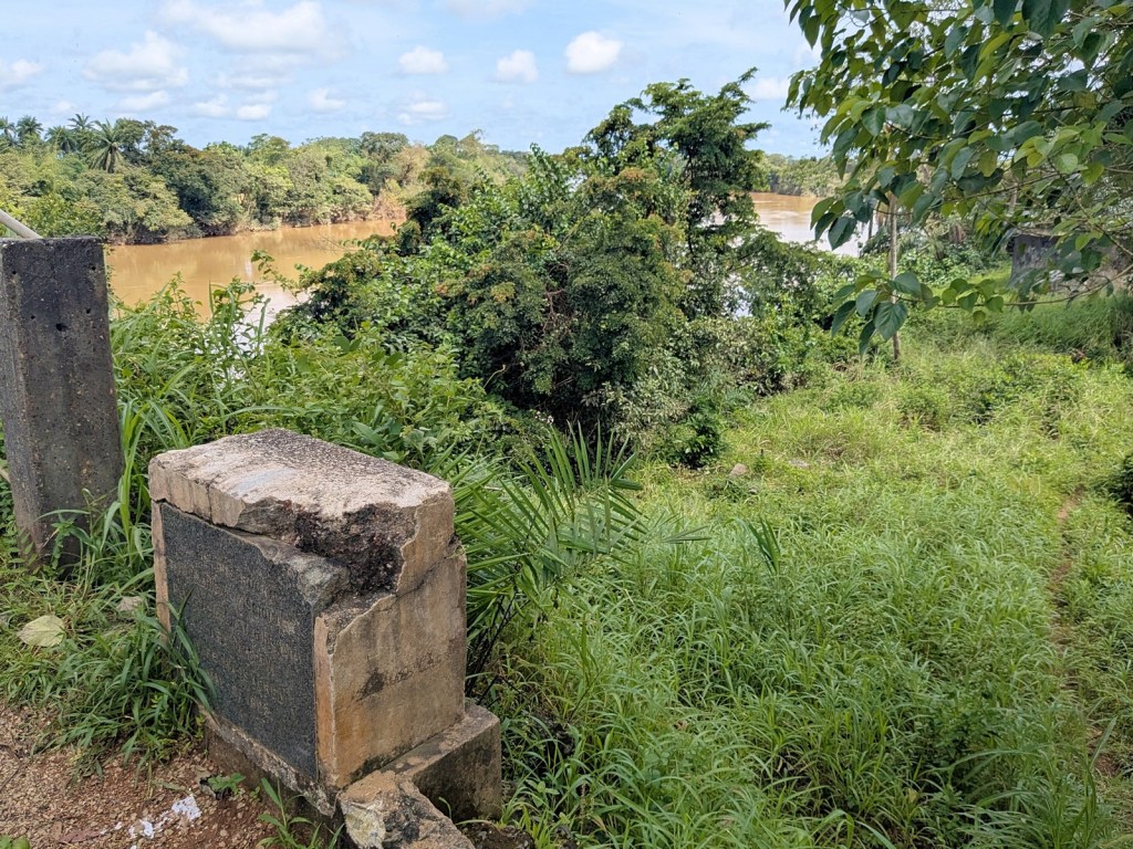 The next stop was a surprise. I had spotted an older bridge from the newer one passing by Taiama, and decided to see what was on the other side. I was very surprised to find a historical marker! It was right on the side of the road, but low down, and hopping out of the car to take a look it read “On this rock the American Missionaries Rev. L.A. McGrew & His Wife Clara McGrew were massacred May 9, 1898.” There are not, on the whole, a lot of historical markers in Sierra Leone, and this one didn’t really give an indication of who put it up. As I was standing there a nice man came up to discuss it, and told me that the rock where the missionaries had been killed was actually a different one he pointed at down the hill and slightly upstream.