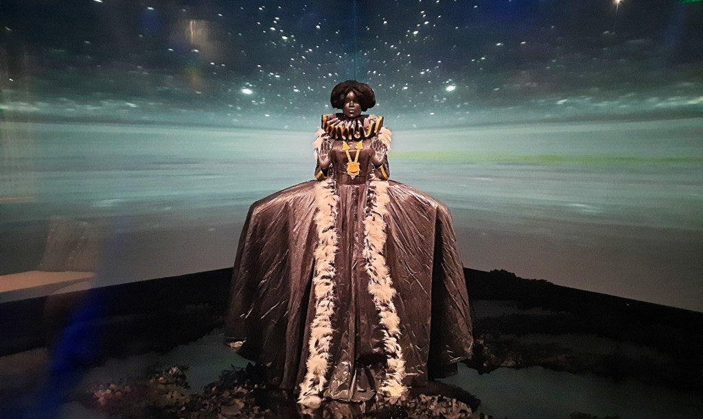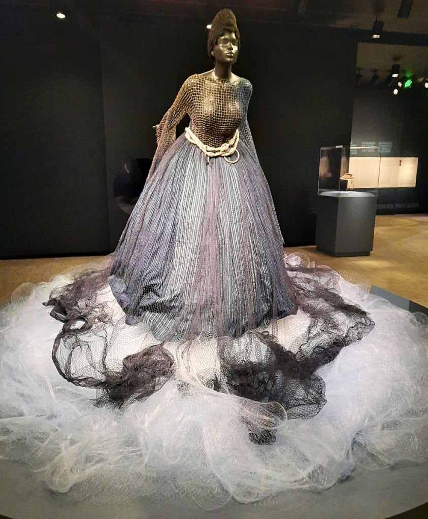 I just absolutely loved how she has put these costumes together, using the meaningful detritus that would be associated with enslavers’ use of the sea to traffic in their fellow humans. I mean the above dress is made out of fishing nets with a belt of rope! Fantastic! And the below dress, I think the use of the fans as the top is inspired, and also frankly I just go gaga over anything made with banknotes!