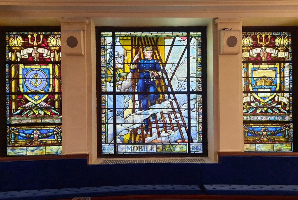 Instead of Jesus or whatever boring stuff other people put into their church windows, this is Admiral Farragut lashed to the rigging in the Battle of Mobile Bay, presumably around the time he apocryphally yelled “Damn the torpedoes, full speed ahead!” which, you know, hells yeah. So the chapel has that going for it at any rate.